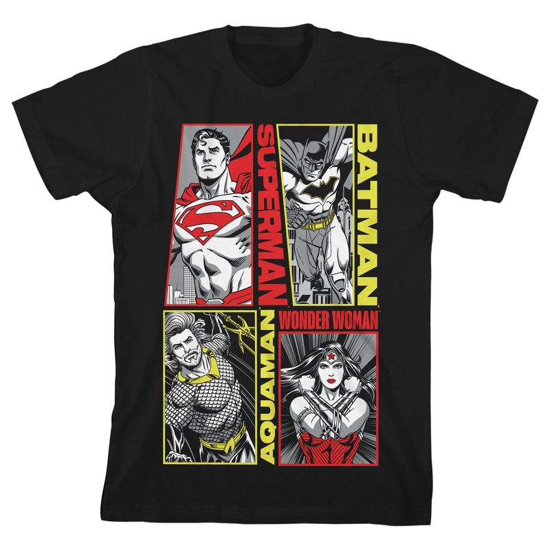 - تصميم مُخصص: تُزيّن صور سوبرمان، وباتمان، وأكوامان، ووندر وومن واجهة هذا التيشيرت الجرافيكي، بينما تُهجّى أسماء الشخصيات بأحرف حمراء وصفراء بجوارها. سيُعجب مُحبو فرقة العدالة بهذا التصميم المُرح.