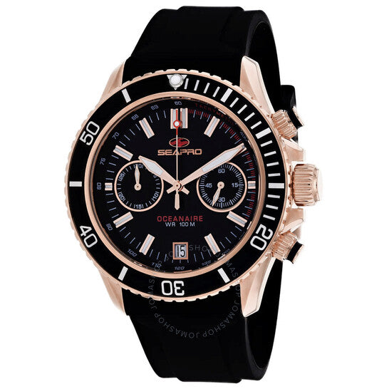 علبة من الفولاذ المقاوم للصدأ بلون الذهب الوردي مع سوار سيليكون أسود. إطار أسود. ميناء أسود مع عقارب ومؤشرات ساعات بلون الذهب الوردي. مؤشرات دقائق حول الحافة الخارجية. نوع الميناء: تناظري. عقارب ومؤشرات مضيئة. عرض التاريخ عند موضع الساعة السادسة. حركة كوارتز. زجاج معدني مقاوم للخدش. غطاء خلفي صلب. شكل دائري، مقاس العلبة: 45 مم. عرض السوار: 22 مم. مشبك بإبزيم. مقاومة للماء حتى عمق 100 متر / 330 قدمًا. الوظائف: كرونوغراف، تاريخ، ساعات، دقائق، ثوانٍ. سلسلة ثراش. ساعة أنيقة. ساعة سيبرو ثراش كرونوغراف كوارتز للرجال بمينا سوداء SP0333.