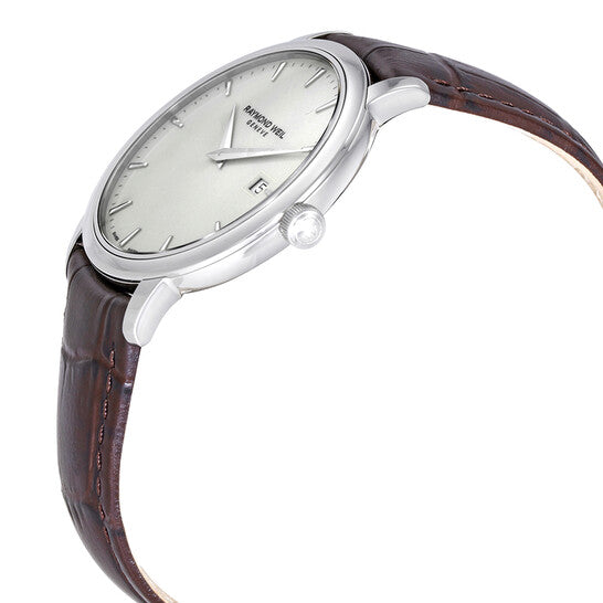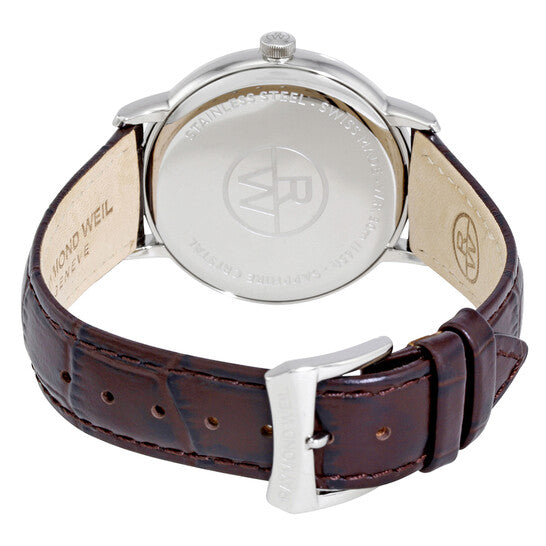علبة من الفولاذ المقاوم للصدأ فضية اللون مع سوار جلدي بني. إطار ثابت من الفولاذ المقاوم للصدأ فضي اللون. ميناء عاجي اللون مع عقارب وعلامات ساعات فضية اللون. علامات دقائق حول الحافة الخارجية. نوع الميناء: تناظري. عرض التاريخ عند موضع الساعة 3. آلية حركة كوارتز. زجاج ياقوت مقاوم للخدش. تاج لولبي. غطاء خلفي صلب. حجم العلبة: 39 مم. سمكها: 8 مم. شكلها دائري. عرض السوار: 18 مم. طول السوار: 9 بوصات. مشبك تانغ. مقاومة للماء حتى عمق 50 مترًا / 165 قدمًا. الوظائف: التاريخ، الساعة، الدقائق. تصميم كاجوال. علامة الساعة: صناعة سويسرية. ساعة ريموند ويل توكاتا للرجال بمينا عاجي 5488-STC-40001.