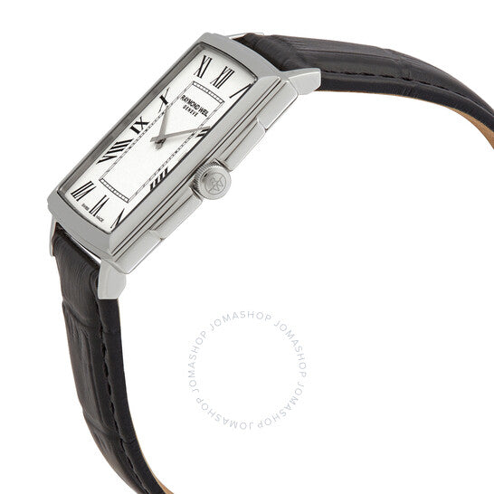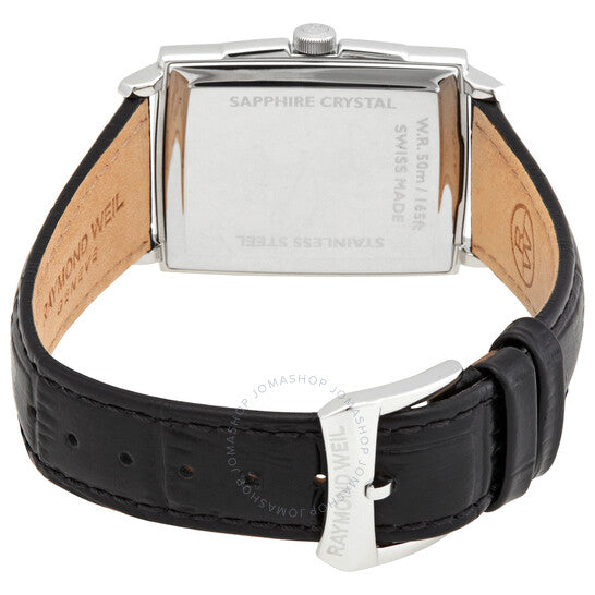 علبة من الفولاذ المقاوم للصدأ مع سوار جلدي أسود. إطار ثابت من الفولاذ المقاوم للصدأ. ميناء أبيض بعقارب فضية اللون وعلامات ساعات بأرقام رومانية. علامات دقائق حول الحافة الخارجية. نوع الميناء: تناظري. عرض التاريخ عند موضع الساعة 3. آلية حركة كوارتز. زجاج ياقوت مقاوم للخدش. تاج قابل للسحب/الدفع. غطاء خلفي صلب. شكل العلبة مستطيل. أبعاد العلبة: 37.25 مم × 29.6 مم. مشبك قابل للطي بزر ضغط. مقاومة للماء حتى عمق 50 مترًا / 165 قدمًا. الوظائف: التاريخ، الساعة، الدقائق. طراز ساعة رسمية. ساعة ريموند ويل توكاتا الرجالية الكلاسيكية المستطيلة من الفولاذ المقاوم للصدأ 5425 - STC-00300.