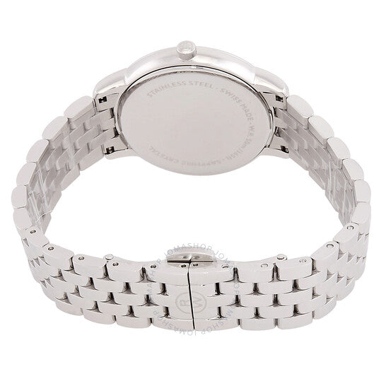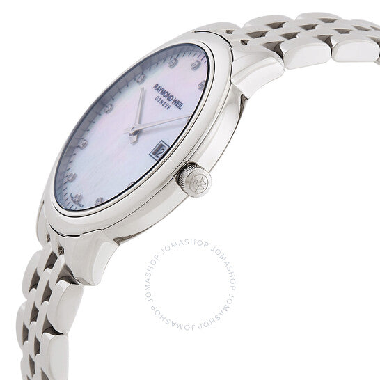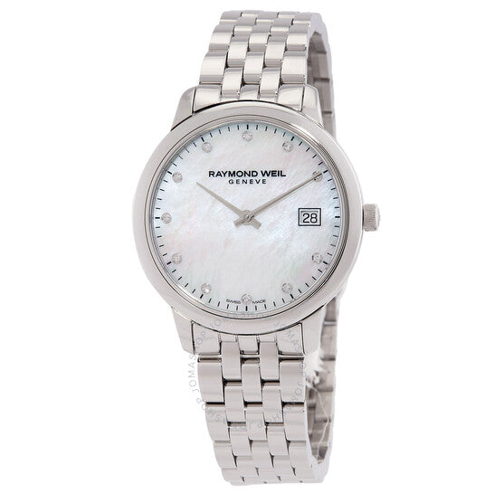 علبة وسوار من الفولاذ المقاوم للصدأ فضي اللون. إطار ثابت من الفولاذ المقاوم للصدأ فضي اللون. ميناء من عرق اللؤلؤ مع عقارب فضية اللون وعلامات ساعات من الألماس. نوع الميناء: تناظري. عرض التاريخ عند موضع الساعة 3. حركة كوارتز. زجاج ياقوت مقاوم للخدش. تاج قابل للسحب/الدفع. غطاء خلفي صلب. شكل العلبة دائري، مقاسها: 34 مم، سمكها: 7 مم. مشبك قابل للطي مع مفتاح أمان. مقاومة للماء حتى عمق 50 مترًا / 165 قدمًا. الوظائف: التاريخ، الساعة، الدقائق. معلومات إضافية: عدد الماسات: 11؛ وزن الماسات: 0.04 قيراط؛ نوع الماس في الميناء: قطع مفرد 8/8 - si1. سلسلة توكاتا. طراز ساعة رسمية. علامة الساعة: صناعة سويسرية. ساعة ريموند ويل توكاتا كوارتز نسائية مرصعة بالألماس 5385-ST-97081.
