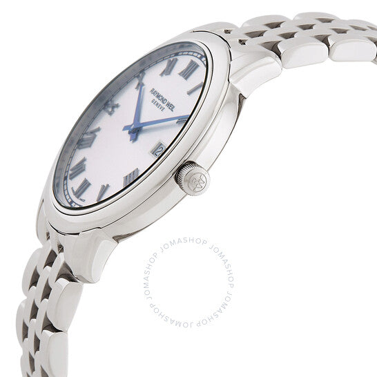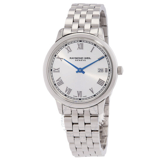 علبة وسوار من الفولاذ المقاوم للصدأ فضي اللون. إطار ثابت من الفولاذ المقاوم للصدأ فضي اللون. ميناء فضي اللون مع عقارب زرقاء وعلامات ساعات رومانية. نوع الميناء: تناظري. عرض التاريخ عند موضع الساعة 3. آلية حركة كوارتز. زجاج ياقوت مقاوم للخدش. تاج قابل للسحب/الدفع. غطاء خلفي صلب. شكل العلبة دائري، مقاسها: 34 مم، سمكها: 7 مم. عرض السوار: 12 مم. مشبك قابل للطي مع مفتاح أمان. مقاومة للماء حتى عمق 50 مترًا / 165 قدمًا. الوظائف: التاريخ، الساعة، الدقائق. سلسلة توكاتا. طراز ساعة رسمية. علامة الساعة: صناعة سويسرية. ساعة ريموند ويل توكاتا كوارتز نسائية بمينا فضي، رقمها 5385-ST-00659.