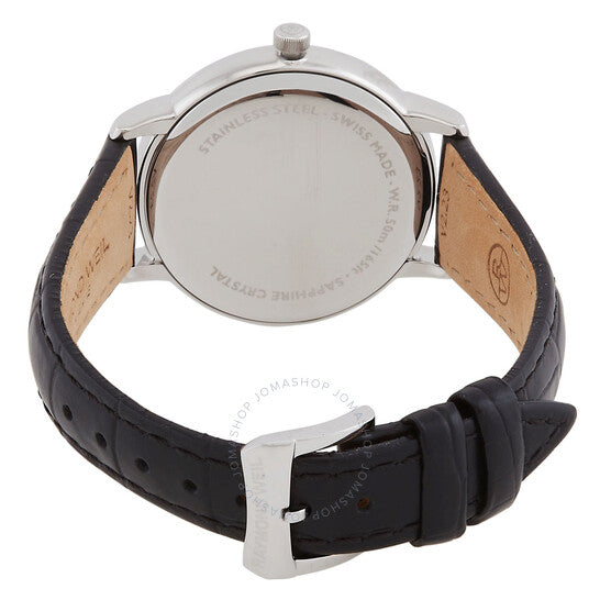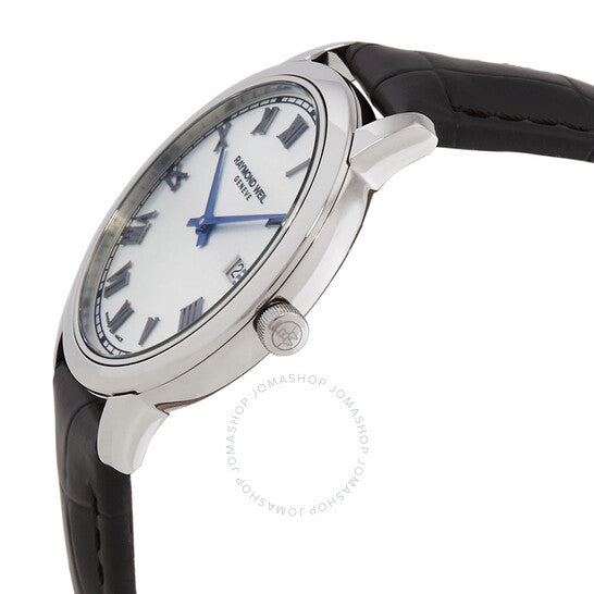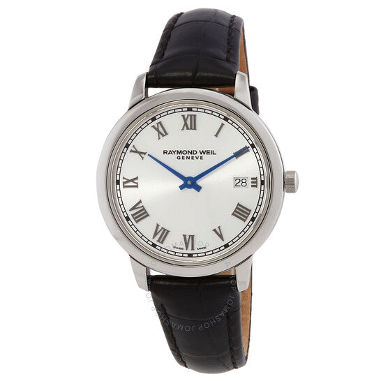علبة فضية اللون من الفولاذ المقاوم للصدأ مع سوار جلدي أسود. إطار ثابت فضي اللون من الفولاذ المقاوم للصدأ. ميناء فضي بعقارب زرقاء وعلامات ساعات رومانية. علامات دقائق حول الحافة الخارجية. نوع الميناء: تناظري. عرض التاريخ عند موضع الساعة 3. آلية حركة كوارتز. زجاج ياقوتي مقاوم للخدش. تاج قابل للسحب/الدفع. غطاء خلفي صلب. شكل دائري، مقاس العلبة: 34 مم، سمكها: 7 مم. عرض السوار: 16 مم. مشبك بإبزيم. مقاومة للماء حتى عمق 50 مترًا / 165 قدمًا. الوظائف: التاريخ، الساعة، الدقائق، الثواني. سلسلة توكاتا. تصميم كاجوال. علامة الساعة: صناعة سويسرية. ساعة ريموند ويل توكاتا كوارتز نسائية بمينا فضي، رقمها 5385-STC-00659.