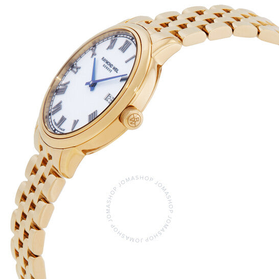 فولاذ مقاوم للصدأ بلون الذهب الأصفر، مع علبة مطلية بالذهب الأصفر بتقنية PVD. مينا بيضاء بعقارب زرقاء وعلامات ساعات رومانية. نوع المينا: تناظري. عرض التاريخ عند موضع الساعة 3. آلية حركة كوارتز. زجاج ياقوتي مقاوم للخدش. تاج قابل للسحب/الدفع. غطاء خلفي صلب. شكل العلبة دائري، مقاسها: 29 مم، سمكها: 6 مم. مشبك قابل للطي مع مفتاح أمان. مقاومة للماء حتى عمق 50 مترًا / 165 قدمًا. الوظائف: التاريخ، الساعة، الدقائق. سلسلة توكاتا. طراز ساعة رسمية. علامة الساعة: صناعة سويسرية. ساعة ريموند ويل توكاتا كوارتز نسائية بمينا بيضاء، رقمها 5985-P-00359.