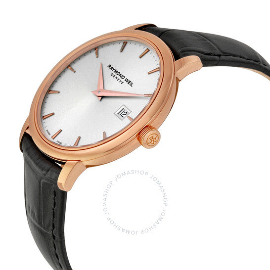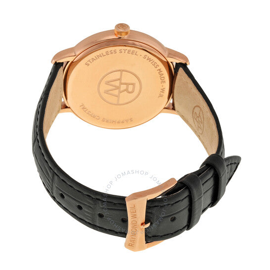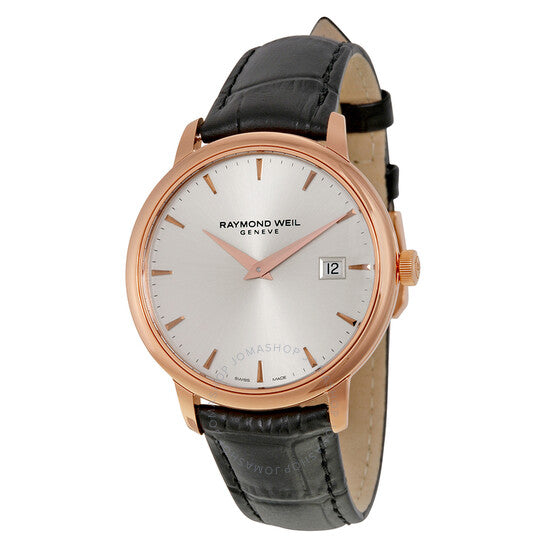 علبة من الفولاذ المقاوم للصدأ مطلية بالذهب الوردي بتقنية PVD، مع سوار أسود من جلد التمساح. إطار ثابت مطلي بالذهب الوردي بتقنية PVD. ميناء فضي اللون مع عقارب وعلامات ساعات ذهبية وردية اللون. علامات دقائق حول الحافة الخارجية. نوع الميناء: تناظري. عرض التاريخ عند موضع الساعة 3. آلية حركة كوارتز. زجاج ياقوتي مقاوم للخدش. تاج قابل للسحب/الدفع. غطاء خلفي صلب. حجم العلبة: 39.5 مم. سمكها: 9.15 مم. شكلها دائري. عرض السوار: 20.3 مم. طول السوار: 8 بوصات. مشبك تانغ. مقاومة للماء حتى عمق 50 مترًا / 165 قدمًا. الوظائف: التاريخ، الساعة، الدقائق، الثواني. طراز ساعة رسمية. علامة الساعة: صناعة سويسرية. إصدارات الساعة: 5488 PC5 65001، 5488.PC5.65001، 5488PC565001. ساعة ريموند ويل توكاتا بمينا فضي للرجال 5488-PC5-65001.