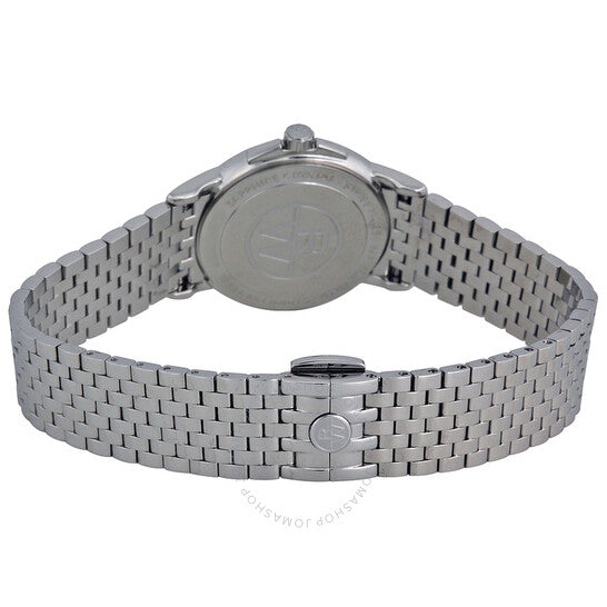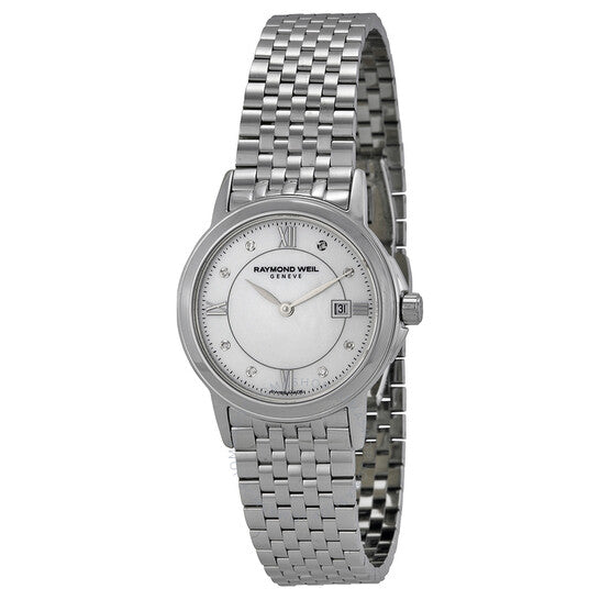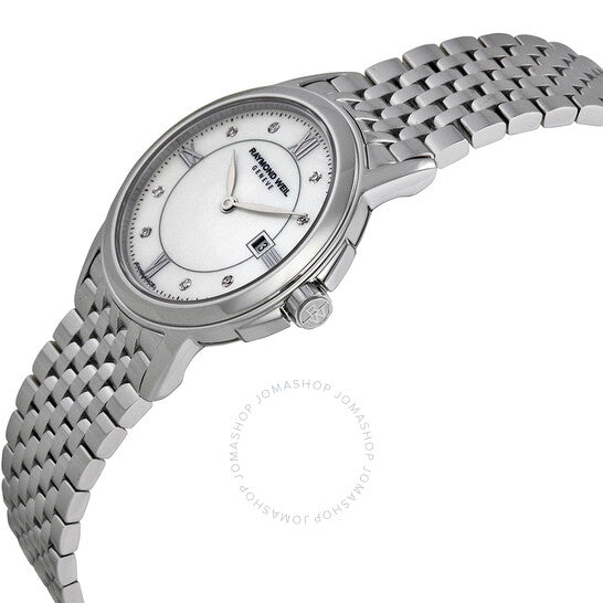 علبة من الفولاذ المقاوم للصدأ مع سوار من الفولاذ المقاوم للصدأ. إطار ثابت من الفولاذ المقاوم للصدأ. ميناء من عرق اللؤلؤ مع عقارب فضية اللون وعلامات ساعات من الماس. أرقام رومانية تُشير إلى الساعات 3 و6 و9 و12. علامات دقائق حول الحافة الخارجية. نوع الميناء: تناظري. عرض التاريخ عند الساعة 3. حركة كوارتز. زجاج ياقوت مقاوم للخدش. تاج قابل للسحب/الدفع. غطاء خلفي صلب. قطر العلبة: 28 مم. سُمكها: 5.7 مم. شكلها دائري. قابلة للطي مع مشبك بزر ضغط. مقاومة للماء حتى عمق 50 مترًا / 165 قدمًا. الوظائف: التاريخ، الساعة، الدقيقة، الثانية. طراز ساعة رسمية. علامة الساعة: صناعة سويسرية. ساعة ريموند ويل تراديشن نسائية من الفولاذ المقاوم للصدأ بمينا عرق اللؤلؤ 5966-ST-00995.