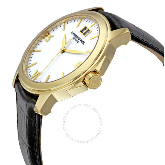 علبة من الفولاذ المقاوم للصدأ مطلية بالذهب عيار ١٨ قيراطًا مع سوار جلدي أسود. إطار ثابت مطلي بالذهب عيار ١٨ قيراطًا. ميناء أبيض بعقارب وعلامات ساعات ذهبية اللون. أرقام رومانية تُشير إلى الساعات ٣ و٦ و٩. علامات دقائق حول الحافة الخارجية. نوع الميناء: تناظري. عرض التاريخ عند الساعة ١٢. حركة كوارتز. زجاج ياقوت مقاوم للخدش. تاج دفع/سحب. غطاء خلفي صلب. قطر العلبة: ٣٩ مم. سُمكها: ٩ مم. عرض السوار: ٢٠ مم. مشبك تانغ. مقاومة للماء حتى عمق ٥٠ مترًا / ١٦٥ قدمًا. الوظائف: التاريخ، الساعة، الدقائق، الثواني. معلومات إضافية: عقارب وعلامات ساعات ذهبية مضيئة. أرقام رومانية عند الساعات ٣ و٦ و٩. عرض تاريخ مزدوج عند الساعة ١٢. تصميم ساعة كاجوال. ساعة ريموند ويل تراديشن للرجال ٥٤٧٦-P-٠٠٣٠٧.