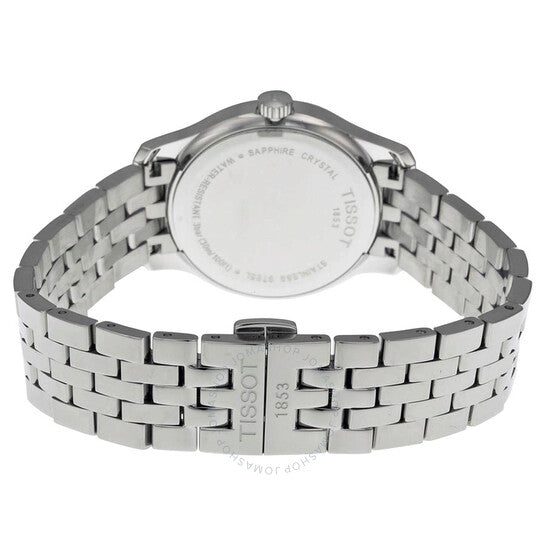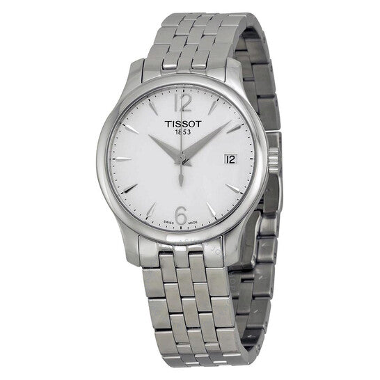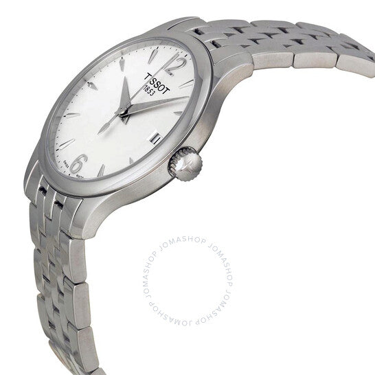 علبة من الفولاذ المقاوم للصدأ مع سوار من الفولاذ المقاوم للصدأ. إطار ثابت من الفولاذ المقاوم للصدأ. ميناء فضي اللون بعقارب فضية اللون وعلامات ساعات. أرقام عربية تُشير إلى موضعي الساعة 6 و12. علامات دقائق حول الحافة الخارجية. نوع الميناء: تناظري. نافذة عرض التاريخ عند موضع الساعة 3. حركة كوارتز ETA عيار F05.111. زجاج ياقوت مقاوم للخدش. تاج قابل للسحب/الدفع. غطاء خلفي صلب. حجم العلبة: 33 مم. سُمكها: 7 مم. شكلها دائري. عرض السوار: 16 مم. طول السوار: 7 بوصات. قابلة للطي مع مشبك بزر ضغط. مقاومة للماء حتى عمق 30 مترًا / 100 قدم. الوظائف: التاريخ، الساعة، الدقيقة، الثانية. تصميم كاجوال. علامة الساعة: صناعة سويسرية. ساعة تيسوت تراديشن نسائية بمينا فضي، T0632101103700.