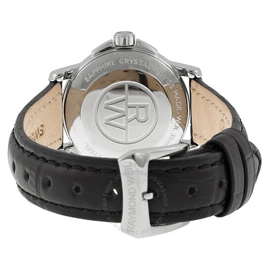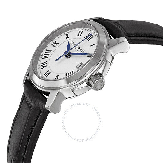 علبة من الفولاذ المقاوم للصدأ مع سوار جلدي أسود. إطار ثابت من الفولاذ المقاوم للصدأ. ميناء أبيض بعقارب زرقاء اللون وعلامات ساعات رومانية. علامات دقائق حول الحافة الخارجية. نوع الميناء: تناظري. عرض التاريخ عند موضع الساعة 3. حركة كوارتز. زجاج ياقوتي مقاوم للخدش. تاج قابل للسحب/الدفع. علبة صلبة من الخلف. قطر العلبة: 27 مم. شكلها دائري. مشبك تانغ. مقاومة للماء حتى عمق 50 مترًا / 165 قدمًا. الوظائف: التاريخ، الساعة، الدقائق، الثانية. طراز ساعة رسمية. علامة الساعة: صناعة سويسرية. ساعة ريموند ويل تراديشن النسائية بمينا أبيض وجلد أسود، رقمها 5378-STC-00300.