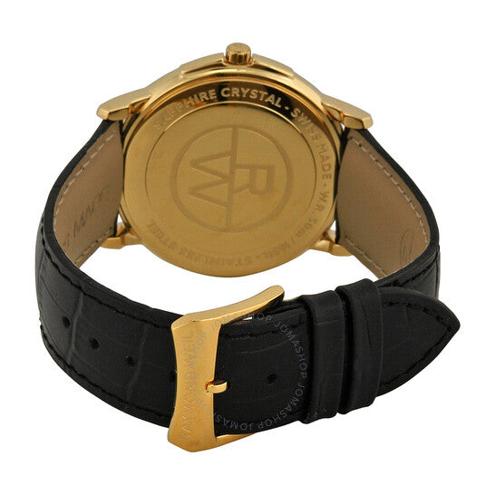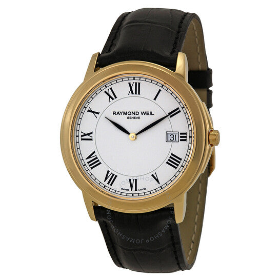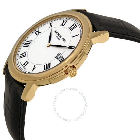 علبة فولاذية مطلية بالذهب الأصفر عيار ١٨ قيراطًا مع سوار أسود من جلد التمساح. إطار ثابت مطلي بالذهب الأصفر عيار ١٨ قيراطًا. ميناء أبيض بعقارب سوداء وعلامات ساعات رومانية. علامات دقائق حول الحافة الخارجية. نوع الميناء: تناظري. عرض التاريخ عند موضع الساعة ٣. حركة كوارتز. زجاج ياقوتي مقاوم للخدش. تاج قابل للسحب/الدفع. غطاء خلفي صلب. قطر العلبة: ٤٠ مم. سُمكها: ٦ مم. شكلها دائري. مشبك تانغ. مقاومة للماء حتى عمق ٥٠ مترًا / ١٦٥ قدمًا. الوظائف: التاريخ، الساعة، الدقائق. تصميم كاجوال. علامة الساعة: صناعة سويسرية. ساعة ريموند ويل تراديشن للرجال، مينا بيضاء، مطلية بالذهب، رقمها ٥٤٦٦١-PC-٠٠٣٠٠.
