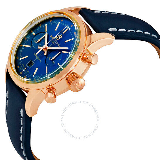 علبة من الذهب الوردي عيار ١٨ قيراطًا مع سوار جلدي أزرق. إطار ثابت من الذهب الوردي عيار ١٨ قيراطًا. ميناء أزرق مع عقارب مضيئة بلون الذهب الوردي وعلامات ساعات. علامات دقائق. علامات تاكيميتر حول الحافة الخارجية. نوع الميناء: تناظري. عقارب وعلامات مضيئة. عرض التاريخ عند موضع الساعة ٦. كرونوغراف - ميناءان فرعيان يعرضان: ٦٠ ثانية و٣٠ دقيقة. حركة بريتلينغ ٤١ أوتوماتيكية مع احتياطي طاقة ٤٢ ساعة. زجاج ياقوت مقاوم للخدش. تاج قابل للسحب/الدفع. غطاء خلفي صلب. حجم العلبة: ٣٨ مم. سمكها: ١٤.٢٥ مم. شكلها دائري. عرض السوار: ٢٠ مم / ١٨ مم. مشبك تانغ. مقاومة للماء حتى عمق ١٠٠ متر / ٣٣٠ قدمًا. الوظائف: التاريخ، الساعة، الدقيقة، الثانية، الكرونوغراف، تاكيميتر. طراز ساعة فاخرة. علامة الساعة: سويسرية الصنع. ساعة بريتلينج ترانس أوشن كرونوغراف أوتوماتيكية للرجال R4131012-C863BLLT.