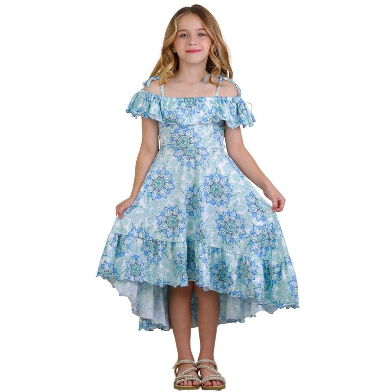 دعها تتألق في فستاننا الأزرق المزهر ذو الكشكشة العالية، وهو مزيج مثالي من الأناقة والسحر لأي مناسبة مشمسة.