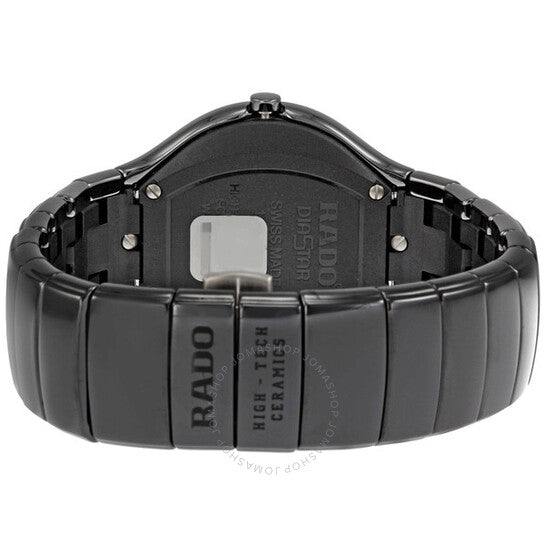 علبة من السيراميك الأسود مع سوار من السيراميك الأسود. إطار ثابت من السيراميك الأسود. ميناء أسود بعقارب ذهبية اللون وعلامات ماسية عند أرباع الساعة. يظهر اسم رادو أسفل موضع الساعة ١٢. نافذة عرض التاريخ عند موضع الساعة ٦. آلية حركة كوارتز. زجاج من الياقوت المقاوم للخدش. غطاء خلفي صلب. قطر العلبة: ٣٨ مم. مشبك أمان بزر ضغط من التيتانيوم. مقاومة للماء حتى عمق ٣٠ مترًا / ١٠٠ قدم. ساعة رادو ترو جوبيلي سيراميك سوداء للرجال، R27653752.