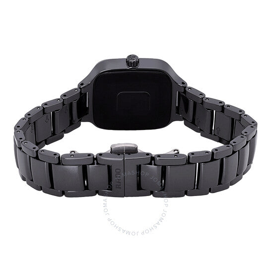 علبة وسوار من السيراميك عالي التقنية والتيتانيوم باللون الأسود. إطار ثابت من السيراميك عالي التقنية باللون الأسود. ميناء أسود بعقارب وعلامات ساعات ذهبية اللون. علامات دقائق حول الحافة الخارجية. نوع الميناء: تناظري. عقارب وعلامات مضيئة. عرض التاريخ عند موضع الساعة السادسة. حركة كوارتز من رادو كاليبر 079. زجاج ياقوت مقاوم للخدش. تاج قابل للسحب/الدفع. غطاء خلفي صلب. شكل العلبة مربع، مقاسها: 29.2 مم، سمكها: 8.1 مم. مشبك قابل للطي مع مفتاح أمان. مقاومة للماء حتى عمق 50 مترًا / 165 قدمًا. الوظائف: التاريخ، الساعة، الدقائق، الثواني. سلسلة ترو سكوير. تصميم ساعة فاخرة. علامة الساعة: صناعة سويسرية. ساعة رادو ترو سكوير كوارتز نسائية بمينا سوداء، R27080172.