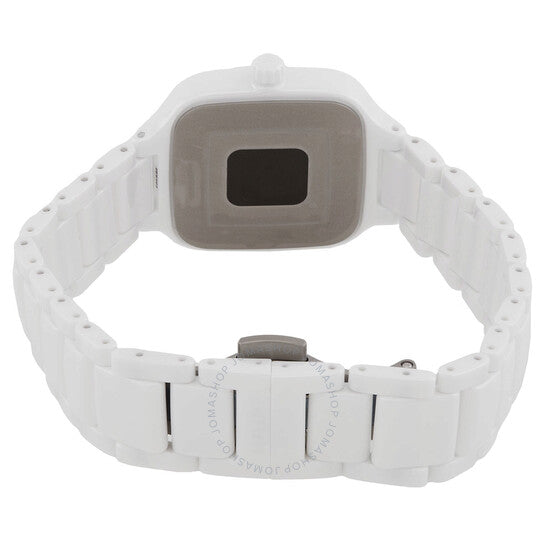 علبة وسوار من السيراميك عالي التقنية والتيتانيوم باللون الأبيض. إطار ثابت من السيراميك عالي التقنية باللون الأبيض. ميناء أبيض بعقارب وعلامات ساعات ذهبية اللون. علامات دقائق حول الحافة الخارجية. نوع الميناء: تناظري. عقارب وعلامات مضيئة. عرض التاريخ عند موضع الساعة السادسة. آلية حركة كوارتز. زجاج ياقوتي مقاوم للخدش. تاج قابل للسحب/الدفع. غطاء خلفي صلب. شكل العلبة مربع، مقاسها: 29.2 مم، سمكها: 8.1 مم. مشبك فراشة. مقاومة للماء حتى عمق 50 مترًا / 165 قدمًا. الوظائف: التاريخ، الساعة، الدقائق، الثواني. سلسلة ترو سكوير. طراز الساعة الرياضية. علامة الساعة: صناعة سويسرية. ساعة رادو ترو سكوير كوارتز نسائية بمينا بيضاء R27072012.