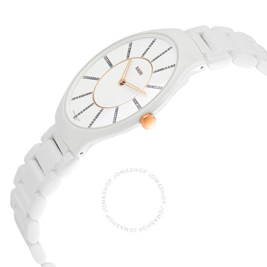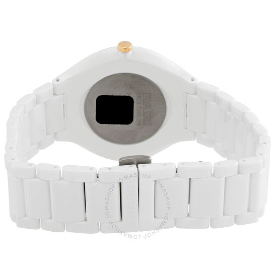 علبة وسوار من السيراميك الأبيض (عالي التقنية). إطار ثابت من السيراميك الأبيض (عالي التقنية). ميناء أبيض بعقارب هيكلية ذهبية اللون وعلامات ساعات مرصعة بالألماس. نوع الميناء: تناظري. عقارب مضيئة. حركة كوارتز من رادو، عيار 140. زجاج من الياقوت المقاوم للخدش. تاج قابل للسحب/الدفع. غطاء خلفي صلب. شكل دائري. حجم العلبة: 39 مم. سمكها: 5 مم. عرض السوار: 20 مم. مشبك قابل للطي بزر ضغط. مقاومة للماء حتى عمق 30 مترًا / 100 قدم. الوظائف: الساعات، الدقائق. تصميم كاجوال. علامة الساعة: صناعة سويسرية. ساعة رادو ترو ثينلاين جوبيلي R27957702.