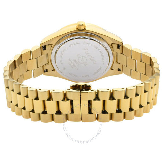 علبة وسوار من الفولاذ المقاوم للصدأ بلون الذهب الأصفر. إطار ثابت من الفولاذ المقاوم للصدأ بلون الذهب الأصفر. ميناء من عرق اللؤلؤ مع عقارب بلون الذهب الأصفر وعلامات ساعات من الألماس. نوع الميناء: تناظري. عرض التاريخ عند موضع الساعة 3. حركة كوارتز روندا كاليبر 705. كريستال ياقوت مقاوم للخدش. تاج قابل للسحب/الدفع. غطاء خلفي صلب. شكل العلبة دائري، مقاسها: 32 مم، سمكها: 9 مم. عرض السوار: 14 مم. مشبك قابل للطي بزر ضغط. مقاومة للماء حتى عمق 50 مترًا / 165 قدمًا. الوظائف: التاريخ، الساعات، الدقائق، الثواني، مؤشر عمر البطارية. معلومات إضافية: نافذة تاريخ مكبرة. سلسلة تورين. تصميم عصري. علامة الساعة: سويسرية. ساعة تورين كوارتز ألماس نسائية GV2 من جيفريل، 12422B.