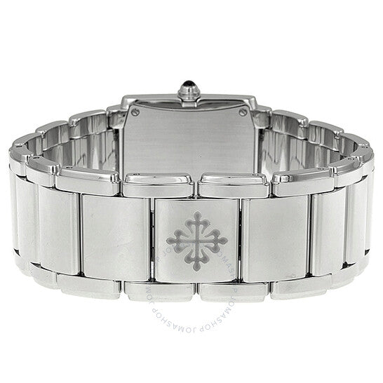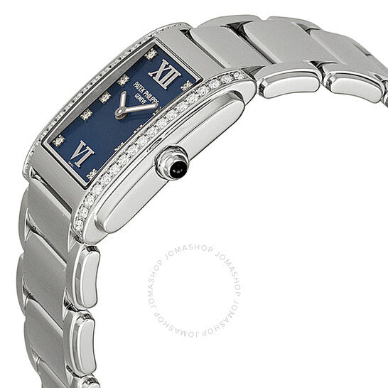 علبة من الفولاذ المقاوم للصدأ مع سوار من الفولاذ المقاوم للصدأ. إطار ثابت من الفولاذ المقاوم للصدأ مرصع بـ 36 ماسة. ميناء أزرق بعقارب فضية مضيئة وعلامات ساعات من الألماس. أرقام رومانية من الذهب الأبيض تُشير إلى موضعي الساعة 6 و12. نوع الميناء: تناظري. عقارب مضيئة. حركة كوارتز من باتيك فيليب، عيار E15. كريستال ياقوت مقاوم للخدش. تاج سحب/دفع مرصع بحجر سوليتير من العقيق. غطاء خلفي صلب. شكل العلبة مستطيل. أبعاد العلبة: 30 مم × 25 مم. سمك العلبة: 6.8 مم. عرض السوار: 25 مم. مشبك قابل للطي. مقاومة للماء حتى عمق 30 مترًا / 100 قدم. الوظائف: الساعات، الدقائق. تصميم ساعة فاخرة. إصدارات الساعة: 4910 10A 012، 4910.10A.012، 491010A012. ساعة باتيك فيليب توينتي-4 متوسطة الحجم للسيدات من الفولاذ المقاوم للصدأ 4910-10A-012.