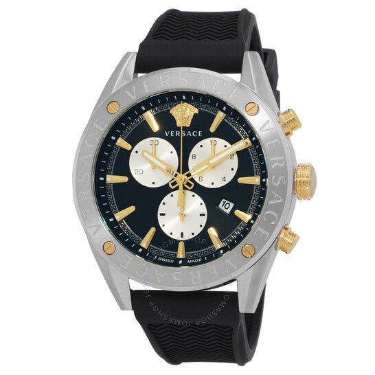علبة فضية اللون من الفولاذ المقاوم للصدأ مع سوار سيليكون أسود. إطار ثابت فضي اللون من الفولاذ المقاوم للصدأ. ميناء أسود بعقارب وعلامات ساعات ذهبية اللون. علامات دقائق حول الحافة الخارجية. رأس ميدوسا ثلاثي الأبعاد عند موضع الساعة ١٢. نوع الميناء: تناظري. عقارب وعلامات مضيئة. عرض التاريخ عند موضع الساعة ٤. كرونوغراف - ثلاثة أقراص فرعية تعرض: ٦٠ ثانية، ٣٠ دقيقة، وعُشر الثانية. حركة كوارتز. زجاج ياقوت مقاوم للخدش. تاج قابل للسحب/الدفع. غطاء خلفي صلب. شكل دائري، حجم العلبة: ٤٤ مم. مشبك تانغ. مقاومة للماء حتى عمق ٥٠ مترًا / ١٦٥ قدمًا. الوظائف: كرونوغراف، تاريخ، ساعة، دقيقة، ثانية. سلسلة V-Chrono. تصميم ساعة كاجوال. علامة الساعة: صناعة سويسرية. ساعة فيرساتشي V-Chrono كرونوغراف كوارتز سوداء للرجال، VEHB00119.