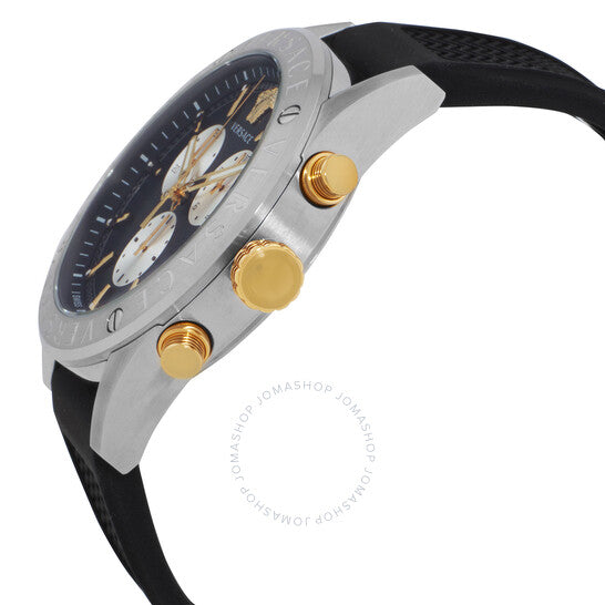 علبة فضية اللون من الفولاذ المقاوم للصدأ مع سوار سيليكون أسود. إطار ثابت فضي اللون من الفولاذ المقاوم للصدأ. ميناء أسود بعقارب وعلامات ساعات ذهبية اللون. علامات دقائق حول الحافة الخارجية. رأس ميدوسا ثلاثي الأبعاد عند موضع الساعة ١٢. نوع الميناء: تناظري. عقارب وعلامات مضيئة. عرض التاريخ عند موضع الساعة ٤. كرونوغراف - ثلاثة أقراص فرعية تعرض: ٦٠ ثانية، ٣٠ دقيقة، وعُشر الثانية. حركة كوارتز. زجاج ياقوت مقاوم للخدش. تاج قابل للسحب/الدفع. غطاء خلفي صلب. شكل دائري، حجم العلبة: ٤٤ مم. مشبك تانغ. مقاومة للماء حتى عمق ٥٠ مترًا / ١٦٥ قدمًا. الوظائف: كرونوغراف، تاريخ، ساعة، دقيقة، ثانية. سلسلة V-Chrono. تصميم ساعة كاجوال. علامة الساعة: صناعة سويسرية. ساعة فيرساتشي V-Chrono كرونوغراف كوارتز سوداء للرجال، VEHB00119.