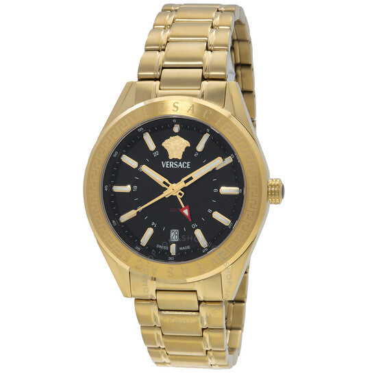 علبة وسوار من الفولاذ المقاوم للصدأ ذهبي اللون. إطار ثابت من الفولاذ المقاوم للصدأ ذهبي اللون. ميناء أسود بعقارب وعلامات ساعات ذهبية اللون. علامات دقائق حول الحافة الخارجية. نوع الميناء: تناظري. عقارب وعلامات مضيئة. عرض التاريخ عند موضع الساعة السادسة. حركة كوارتز. تاج قابل للسحب/الدفع. غطاء خلفي صلب. شكل العلبة دائري، مقاسها: ٤٢ مم. إبزيم قابل للطي بزر ضغط. مقاومة للماء حتى عمق ٥٠ مترًا / ١٦٥ قدمًا. الوظائف: توقيت غرينتش، التاريخ، الساعة، الدقيقة، الثانية. سلسلة V-code. طراز الساعة الرياضية. علامة الساعة: صناعة سويسرية. ساعة فيرساتشي V-Code GMT كوارتز للرجال بمينا أسود VEAFA0724.