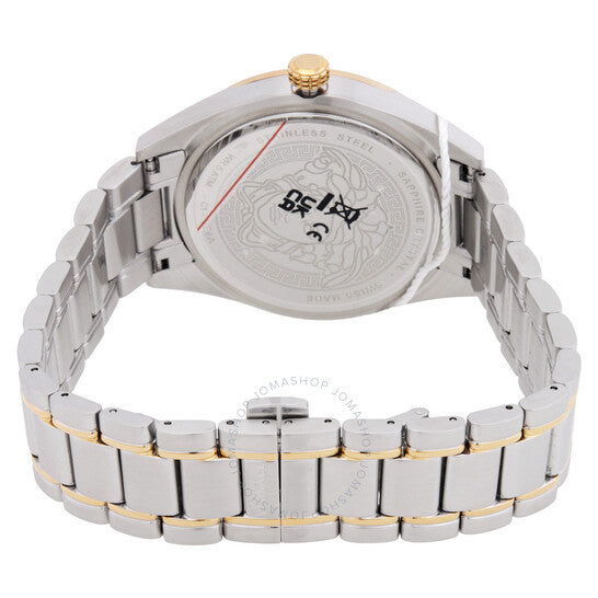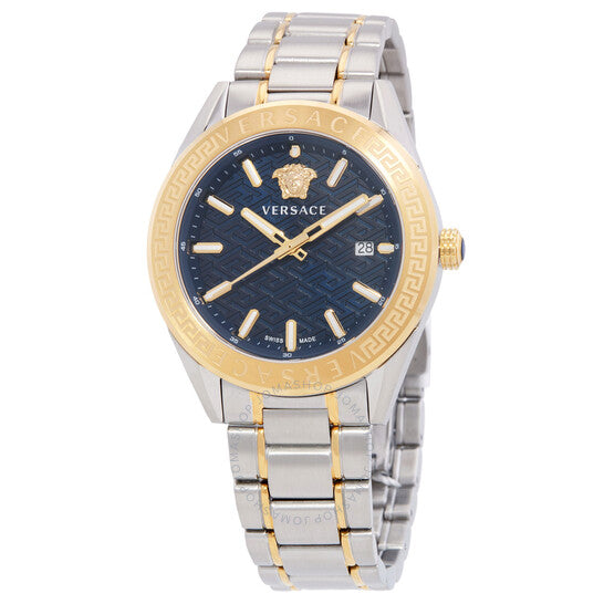 علبة فضية اللون من الفولاذ المقاوم للصدأ مع سوار ثنائي اللون (فضي وذهبي). إطار ثابت من الفولاذ المقاوم للصدأ ذهبي اللون. ميناء أزرق بعقارب ذهبية اللون وعلامات ساعات رومانية. علامات دقائق حول الحافة الخارجية. نوع الميناء: تناظري. عرض التاريخ عند موضع الساعة 3. حركة كوارتز. زجاج ياقوتي مقاوم للخدش. تاج قابل للسحب/الدفع. غطاء خلفي صلب. شكل دائري، مقاس العلبة: 42 مم. مشبك إغلاق فراشة. مقاومة للماء حتى عمق 50 مترًا / 165 قدمًا. الوظائف: التاريخ، الساعة، الدقيقة، الثانية. سلسلة V-code. طراز ساعة رسمية. علامة الساعة: صناعة سويسرية. ساعة فيرساتشي V-Code كوارتز للرجال بمينا زرقاء، VE6A00523.
