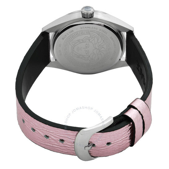 علبة من الفولاذ المقاوم للصدأ فضية اللون مع سوار جلدي وردي. إطار ثابت من الفولاذ المقاوم للصدأ فضي اللون. ميناء وردي مع عقارب وعلامات ساعات فضية اللون. علامات دقائق حول الحافة الخارجية. نوع الميناء: تناظري. حركة كوارتز. زجاج ياقوت مقاوم للخدش. تاج قابل للسحب/الدفع. غطاء خلفي صلب. شكل دائري، مقاس العلبة: 36 مم. مشبك تانغ. مقاومة للماء حتى عمق 50 مترًا / 165 قدمًا. الوظائف: ساعة، دقيقة. سلسلة V-code. طراز ساعة رسمية. علامة الساعة: صناعة سويسرية. ساعة فيرساتشي V-Code كوارتز نسائية بمينا وردي VE8I00124.