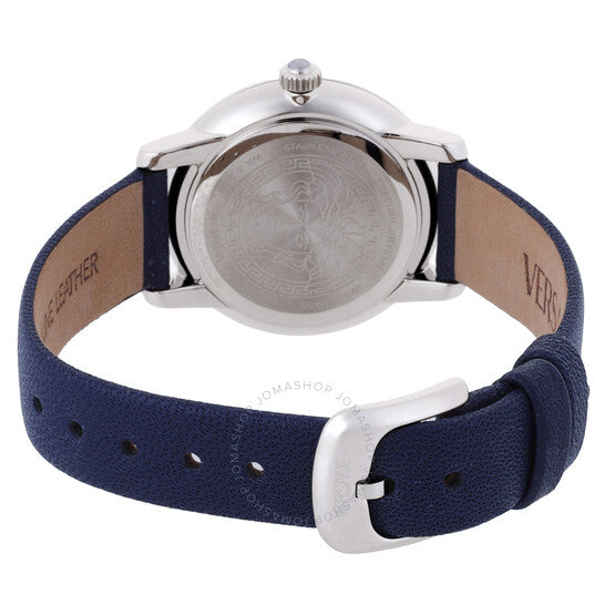 علبة من الفولاذ المقاوم للصدأ فضية اللون مع سوار جلدي أزرق. إطار ثابت من الفولاذ المقاوم للصدأ فضي اللون. ميناء أزرق مع عقارب فضية اللون وعلامات ساعات. نوع الميناء: تناظري. حركة كوارتز. زجاج ياقوتي مقاوم للخدش. تاج قابل للسحب/الدفع. غطاء خلفي صلب. شكل دائري، مقاس العلبة: 30 مم. مشبك بإبزيم. مقاومة للماء حتى عمق 30 مترًا / 100 قدم. الوظائف: الساعات، الدقائق. سلسلة V-Icon. تصميم كاجوال. علامة الساعة: صناعة سويسرية. ساعة فيرساتشي V-Icon كوارتز نسائية بمينا زرقاء VEUCA0124.