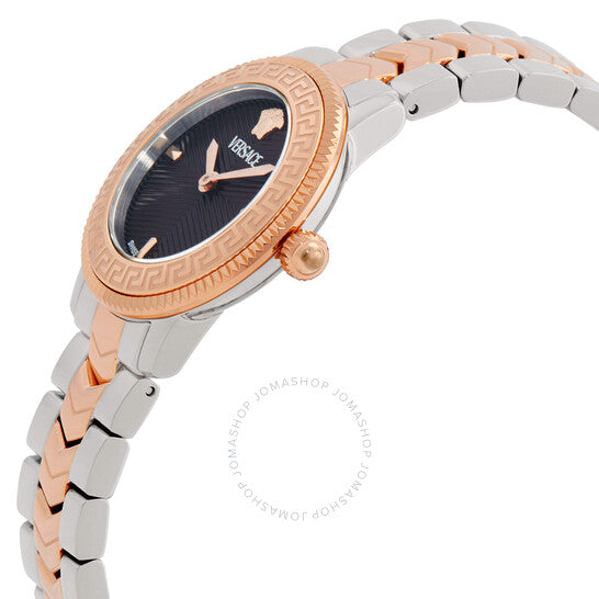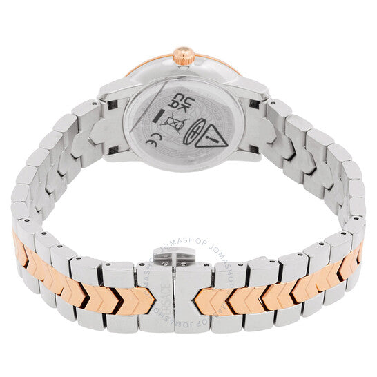 علبة من الفولاذ المقاوم للصدأ فضية اللون مع سوار من الفولاذ المقاوم للصدأ ثنائي اللون (فضي وذهبي وردي). إطار ثابت من الفولاذ المقاوم للصدأ ذهبي وردي. ميناء بني مع عقارب ومؤشرات ساعات ذهبية وردية اللون. نوع الميناء: تناظري. حركة كوارتز. زجاج ياقوتي مقاوم للخدش. تاج قابل للسحب/الدفع. غطاء خلفي صلب. شكل دائري، مقاس العلبة: 30 مم. مشبك قابل للطي. مقاومة للماء حتى عمق 30 مترًا / 100 قدم. الوظائف: الساعات، الدقائق. سلسلة V-Icon. تصميم كاجوال. علامة الساعة: صناعة سويسرية. ساعة فيرساتشي V-Icon كوارتز نسائية بمينا بني VEUCA0624.