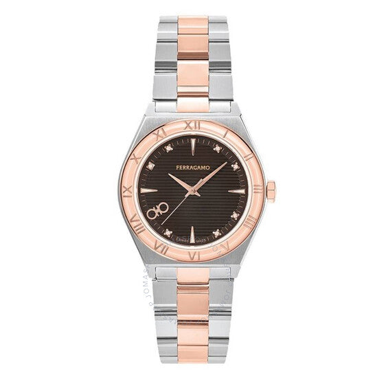 علبة من الفولاذ المقاوم للصدأ فضية اللون مع سوار من الفولاذ المقاوم للصدأ ثنائي اللون (فضي وذهبي وردي). إطار ثابت من الفولاذ المقاوم للصدأ ذهبي وردي. ميناء بني بنقشة أشعة الشمس، مع عقارب ذهبية وردية ومؤشرات ساعات مرصعة بالألماس. شعار Gancini عند موضع الساعة 8. مؤشرات دقائق حول الحافة الخارجية. نوع الميناء: تناظري. حركة كوارتز. تاج قابل للسحب/الدفع. غطاء خلفي صلب. شكل دائري، حجم العلبة: 28 مم. مقاومة للماء حتى عمق 50 مترًا / 165 قدمًا. الوظائف: الساعات، الدقائق، الثواني. سلسلة فيغا أبر إيست. طراز ساعة رسمية. علامة الساعة: صناعة سويسرية. ساعة فيراغامو فيغا أبر إيست كوارتز نسائية مرصعة بالألماس SFKY00423.