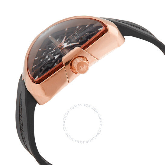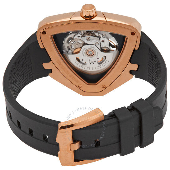 علبة من الفولاذ المقاوم للصدأ بلون الذهب الوردي مع سوار مطاطي أسود. إطار ثابت بلون الذهب الوردي. ميناء أسود (مُقصوص) بعقارب ومؤشرات ساعات بلون الذهب الوردي. نوع الميناء: تناظري. عقارب ومؤشرات مضيئة. حركة هاميلتون أوتوماتيكية من عيار H-10-S، مبنية على ETA C07.111، تحتوي على 25 جوهرة، تنبض بمعدل 21600 ذبذبة في الساعة، ولديها احتياطي طاقة يدوم حوالي 80 ساعة. زجاج من الياقوت المقاوم للخدش. غطاء خلفي شفاف. شكل العلبة مثلث. حجم العلبة: 42.5 مم. مشبك تانغ. مقاومة للماء حتى عمق 50 مترًا / 165 قدمًا. الوظائف: الساعات، الدقائق، الثواني. سلسلة فينتورا. طراز الساعة الرياضية. علامة الساعة: صناعة سويسرية. ساعة هاميلتون فينتورا أوتوماتيكية للرجال بمينا أسود H24525331.