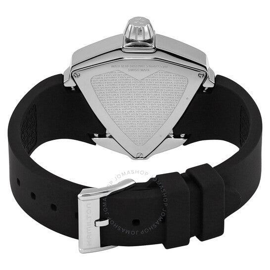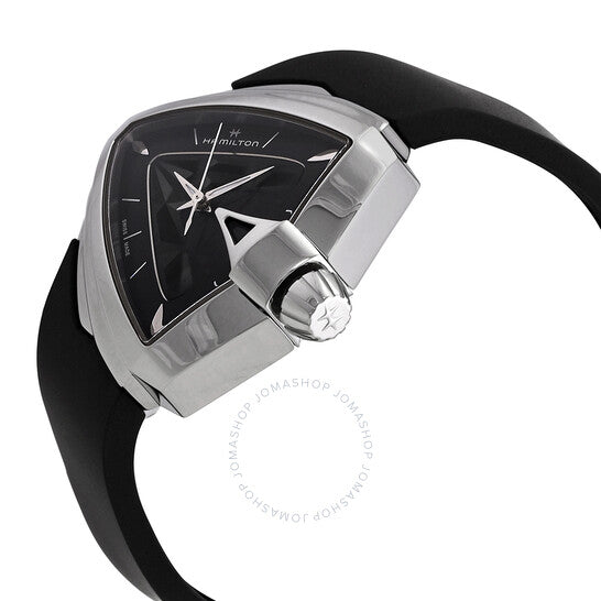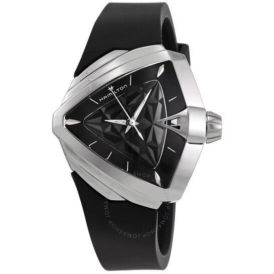 علبة من الفولاذ المقاوم للصدأ فضية اللون مع سوار مطاطي أسود. إطار ثابت من الفولاذ المقاوم للصدأ فضي اللون. ميناء أسود مع عقارب فضية اللون وعلامات ساعات. نوع الميناء: تناظري. حركة كوارتز ETA Caliber F03.101. زجاج ياقوت مقاوم للخدش. غطاء خلفي صلب. شكل العلبة مثلث، مقاسها: 34.5 × 38 مم. عرض السوار: 16 مم. مشبك بإبزيم. مقاومة للماء حتى عمق 50 مترًا / 165 قدمًا. الوظائف: الساعات، الدقائق، الثواني. سلسلة فينتورا. تصميم كاجوال. علامة الساعة: صناعة سويسرية. ساعة هاميلتون فينتورا كوارتز نسائية بمينا سوداء H24251330.