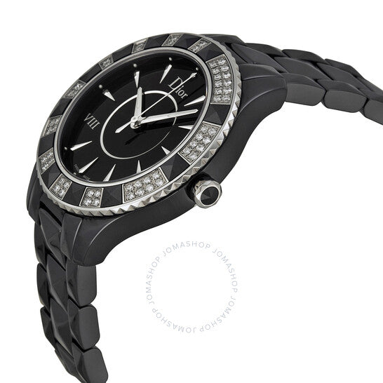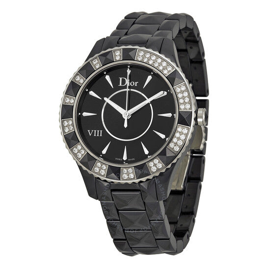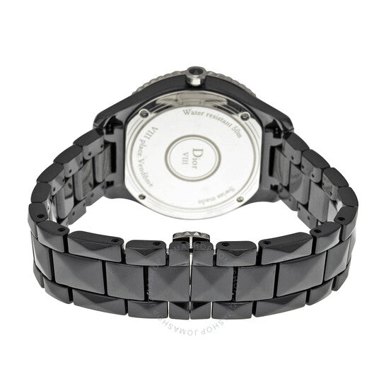 علبة من السيراميك الأسود مع سوار من السيراميك الأسود. إطار دوار أحادي الاتجاه من الفولاذ المقاوم للصدأ مع لمسات هرمية من السيراميك الأسود ومرصع بالألماس. ميناء أسود بعقارب فضية مضيئة وعلامات ساعات. يظهر الرقم الروماني عند موضع الساعة 8. نوع الميناء: تناظري. عقارب مضيئة. حركة كوارتز. زجاج ياقوت مقاوم للخدش. تاج قابل للسحب/الدفع. غطاء خلفي صلب. شكل دائري. حجم العلبة: 38 مم. سمكها: 10 مم. عرض السوار: 15 مم. طول السوار: 7 بوصات. مشبك قابل للطي بزر ضغط. مقاومة للماء حتى عمق 50 مترًا / 165 قدمًا. الوظائف: الساعات، الدقائق، الثواني. تصميم ساعة فاخرة. علامة الساعة: صناعة سويسرية. ساعة ديور VIII كريستال دايموند سوداء سيراميك نسائية CD1241E0C001.