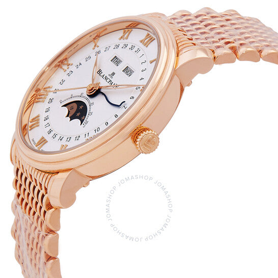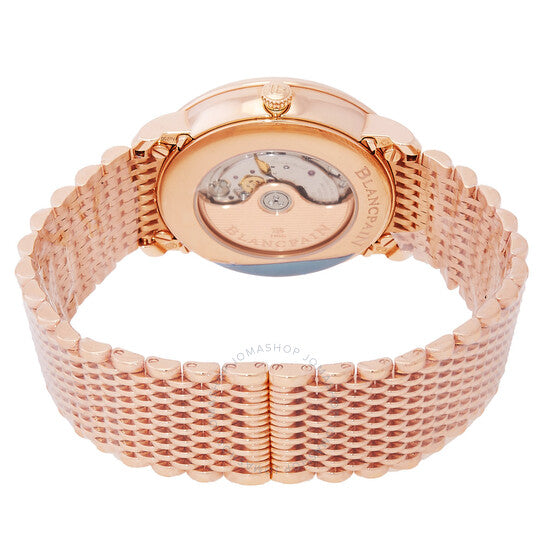 علبة من الذهب الوردي عيار ١٨ قيراطًا، مع سوار من الذهب الوردي عيار ١٨ قيراطًا. إطار ثابت من الذهب الوردي عيار ١٨ قيراطًا. ميناء من الأوبالين مع عقارب من الذهب الوردي وعلامات ساعات بأرقام رومانية. نوع الميناء: تناظري. مؤشر للتاريخ. ميناء فرعي واحد يعرض أطوار القمر. حركة أوتوماتيكية من نوع بلانكبان كاليبر ٦٦٥٤، تحتوي على ٢٨ جوهرة، مكونة من ٣٢١ جزءًا، تنبض بتردد ٢٨٨٠٠ ذبذبة في الساعة، وتحتفظ باحتياطي طاقة يدوم حوالي ٧٢ ساعة. زجاج من الياقوت المقاوم للخدش. تاج قابل للسحب/الدفع. هيكل دائري، مقاسه ٤٠ مم، سمكه ١٠.٦٥ مم. عرض السوار: ٢٢ مم. مقاومة للماء حتى عمق ٣٠ مترًا / ١٠٠ قدم. الوظائف: تقويم كامل، طور القمر، الشهر، التاريخ، اليوم، الساعة، الدقيقة، الثانية. سلسلة فيليريت. تصميم ساعة فاخر. علامة الساعة: صناعة سويسرية. ساعة بلانكبان فيليريت أوتوماتيكية للرجال 6654-3642-MMB.