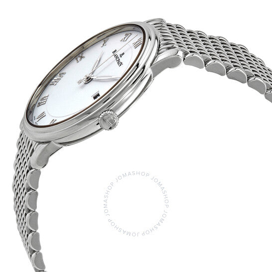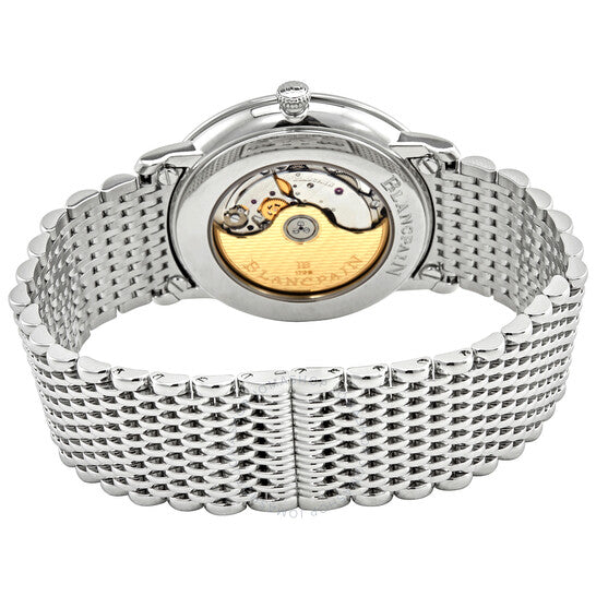 علبة من الفولاذ المقاوم للصدأ مع سوار من الفولاذ المقاوم للصدأ. إطار ثابت من الفولاذ المقاوم للصدأ. ميناء أبيض بعقارب فضية مضيئة على شكل ورقة شجر، وعلامات ساعات بأرقام رومانية. نوع الميناء: تناظري. عرض التاريخ عند موضع الساعة الثالثة. حركة أوتوماتيكية من بلانبان، عيار 1151، تحتوي على 28 جوهرة، مكونة من 210 أجزاء، تنبض بمعدل 21600 ذبذبة في الساعة، ولديها احتياطي طاقة يصل إلى 100 ساعة تقريبًا. زجاج من الياقوت المقاوم للخدش. تاج قابل للسحب/الدفع. غطاء خلفي شفاف. شكل دائري. حجم العلبة: 40 مم. سمكها: 8.7 مم. مشبك قابل للطي. مقاومة للماء حتى عمق 30 مترًا / 100 قدم. الوظائف: التاريخ، الساعة، الدقيقة، الثانية. سلسلة فيليريت. تصميم ساعة فاخرة. علامة الساعة: صناعة سويسرية. ساعة بلانبان فيليريت أوتوماتيكية للرجال 6651-1127-MMB.