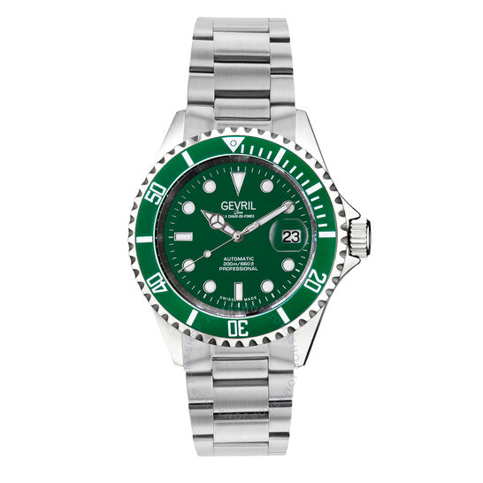 علبة من الفولاذ المقاوم للصدأ مع سوار من الفولاذ المقاوم للصدأ. إطار دوار أحادي الاتجاه من الفولاذ المقاوم للصدأ مع حلقة سيراميك خضراء مرصعة. ميناء أخضر مع عقارب مضيئة فضية اللون وعلامات ساعات منقطة. علامات دقائق حول الحافة الخارجية. نوع الميناء: تناظري. عقارب وعلامات مضيئة. عرض التاريخ عند موضع الساعة 3. حركة أوتوماتيكية من عيار Sellita SW200، تحتوي على 26 جوهرة، تنبض بمعدل 28800 ذبذبة في الساعة، ولديها احتياطي طاقة لمدة 38 ساعة تقريبًا. زجاج من الياقوت المقاوم للخدش. تاج لولبي. غطاء خلفي صلب. شكل دائري. حجم العلبة: 43 مم. سمك العلبة: 13 مم. عرض السوار: 20 مم. مشبك قابل للطي بزر ضغط. مقاومة للماء حتى عمق 200 متر / 660 قدمًا. الوظائف: التاريخ، الساعة، الدقائق، الثواني. معلومات إضافية: نافذة تاريخ مكبرة. سلسلة وول ستريت. تصميم ساعة فاخرة. ملصق الساعة: صناعة سويسرية. ساعة جيفريل وول ستريت أوتوماتيكية للرجال بمينا أخضر 4859A.