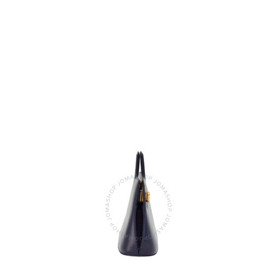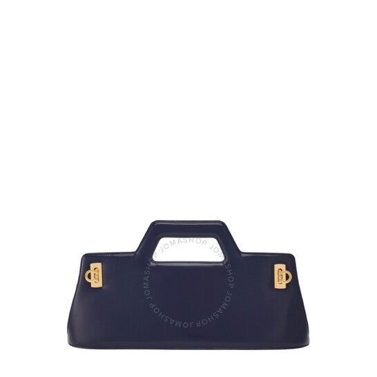 حقيبة فيراغامو نسائية بمقبض علوي. رمز المنتج: 213484 766579. الخامة: جلد عجل. اللون: أزرق. المقاس: الطول: 37 سم × الارتفاع: 20 سم × العمق: 9 سم. حقيبة واندا إيست ويست من جلد العجل. تتميز هذه الحقيبة بقفلين مزخرفين بشعار غانشيني، ومقبضين، وحزام كتف قابل للفصل والتعديل، وأجزاء معدنية فضية اللون، وجيب داخلي بسحاب. جلد عجل 100%. صنع في إيطاليا.