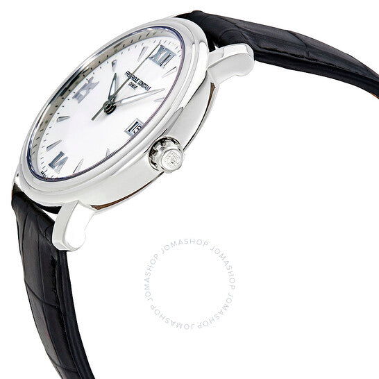 علبة من الفولاذ المقاوم للصدأ مع سوار جلدي أسود. إطار ثابت من الفولاذ المقاوم للصدأ. ميناء أبيض مع عقارب فضية مضيئة ومؤشرات ساعات. أرقام رومانية تُشير إلى الساعات 6 و9 و12. مؤشرات دقائق حول الحافة الخارجية. نوع الميناء: تناظري. عقارب مضيئة. عرض التاريخ عند الساعة 3. حركة كوارتز روندا 515H2. زجاج ياقوتي مقاوم للخدش. غطاء خلفي صلب. حجم العلبة: 38 مم. شكل دائري. مشبك تانغ. مقاومة للماء حتى عمق 30 مترًا / 100 قدم. الوظائف: التاريخ، الساعة، الدقيقة، الثانية. تصميم ساعة فاخرة. علامة الساعة: صناعة سويسرية. ساعة فريدريك كونستانت للرجال، بمينا أبيض وجلد أسود، FC-240HW3P6.