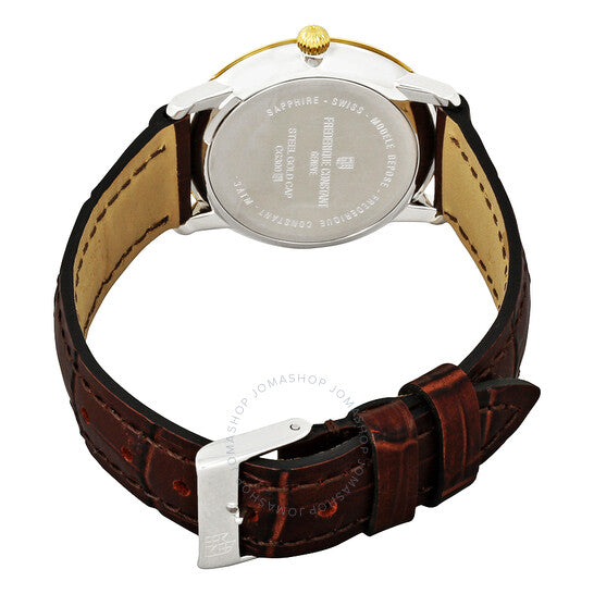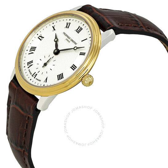 علبة من الفولاذ المقاوم للصدأ بلون الذهب الأصفر مع سوار جلدي بني. إطار ثابت بلون الذهب الأصفر. ميناء أبيض بعقارب سوداء وعلامات ساعات رومانية. علامات دقائق حول الحافة الخارجية. نوع الميناء: تناظري. ميناء فرعي للثواني عند موضع الساعة السادسة. حركة كوارتز من عيار فريدريك كونستانت FC-235. زجاج ياقوت مقاوم للخدش. تاج قابل للسحب/الدفع. غطاء خلفي صلب. حجم العلبة: 28.6 مم. شكل دائري. مشبك تانغ. مقاومة للماء حتى عمق 30 مترًا / 100 قدم. الوظائف: الساعات، الدقائق، الثواني. طراز ساعة رسمية. علامة الساعة: صناعة سويسرية. ساعة فريدريك كونستانت نسائية بمينا أبيض وجلد بني FC-235M1SZ7.