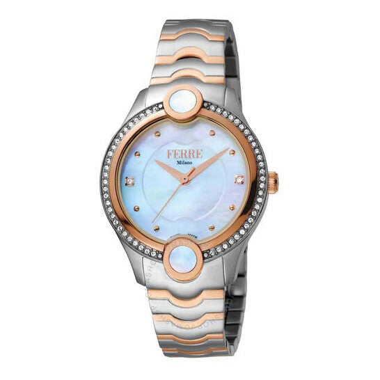 علبة فضية من الفولاذ المقاوم للصدأ مع سوار بلونين من الفولاذ المقاوم للصدأ. إطار فضي ثابت من الفولاذ المقاوم للصدأ. ميناء أبيض من عرق اللؤلؤ مع عقارب ومؤشرات ساعات باللون الذهبي الوردي. نوع الميناء: تناظري. حركة كوارتز. زجاج معدني مقاوم للخدش. تاج ضغط/سحب. شكل العلبة دائري، مقاسها: 34 مم، سمكها: 8.3 مم. عرض السوار: 14 مم، طوله: 7.5 بوصة. مشبك قابل للطي. مقاومة للماء حتى عمق 50 مترًا / 165 قدمًا. وظائفها: الساعات، الدقائق، الثواني. تصميم كاجوال. علامة الساعة: صناعة سويسرية. ساعة فيري ميلانو نسائية بمينا أبيض من عرق اللؤلؤ FM1L082M0031.