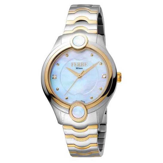 علبة فضية من الفولاذ المقاوم للصدأ مع سوار من الفولاذ المقاوم للصدأ ثنائي اللون. إطار ثابت من الفولاذ المقاوم للصدأ ذهبي اللون. ميناء أبيض من عرق اللؤلؤ مع عقارب ذهبية اللون وعلامات ساعات. نوع الميناء: تناظري. حركة كوارتز. زجاج معدني مقاوم للخدش. تاج ضغط/سحب. شكل العلبة دائري، مقاسها: 34 مم، سمكها: 8.3 مم. عرض السوار: 14 مم، طوله: 7.5 بوصة. مشبك قابل للطي. مقاومة للماء حتى عمق 50 مترًا / 165 قدمًا. الوظائف: الساعات، الدقائق، الثواني. تصميم كاجوال. علامة الساعة: صناعة سويسرية. ساعة فيري ميلانو نسائية بمينا أبيض من عرق اللؤلؤ FM1L083M0071.