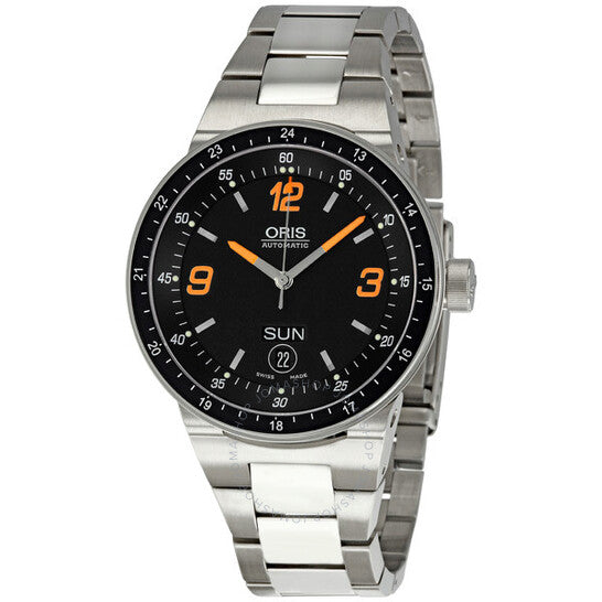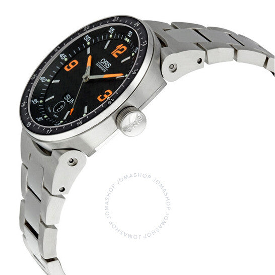 علبة من الفولاذ المقاوم للصدأ مع سوار من الفولاذ المقاوم للصدأ. إطار ثابت مطلي بالأيونات السوداء. ميناء أسود من ألياف الكربون مع عقارب فضية/برتقالية ومؤشرات ساعات. أرقام عربية تُشير إلى الساعات 3 و9 و12. مؤشرات دقائق حول الحافة الخارجية. مؤشرات وعقارب مضيئة بتقنية سوبرلومينوفا C3. عرض يوم الأسبوع والتاريخ أعلى موضع الساعة 6. آلية حركة أوتوماتيكية. زجاج ياقوت مقاوم للخدش. تاج لولبي. ظهر هيكلي. قطر العلبة: 42 مم. سُمكها: 11.81 مم. مشبك قابل للطي. مقاومة للماء حتى عمق 50 مترًا / 165 قدمًا. الوظائف: التاريخ، اليوم، الساعة، الدقيقة، الثانية. ساعة أوريس ويليامز F1 الأوتوماتيكية للرجال من الفولاذ المقاوم للصدأ، 635-7595-4194MB.
