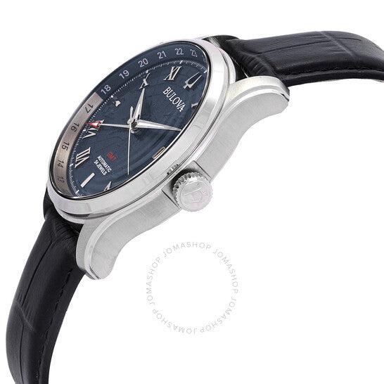 علبة فضية اللون من الفولاذ المقاوم للصدأ مع سوار جلدي أسود. إطار ثابت فضي اللون من الفولاذ المقاوم للصدأ. ميناء أزرق بعقارب فضية اللون وعلامات ساعات رومانية. علامات دقائق حول الحافة الخارجية. نوع الميناء: تناظري. عقارب مضيئة. عرض التاريخ عند موضع الساعة 3. حركة أوتوماتيكية. زجاج ياقوت مقاوم للخدش. تاج قابل للسحب/الدفع. غطاء خلفي شفاف. شكل دائري، مقاس العلبة: 43 مم. عرض السوار: 22 مم. مشبك قابل للطي. مقاومة للماء حتى عمق 30 مترًا / 100 قدم. الوظائف: التاريخ، توقيت غرينتش، الساعات، الدقائق، الثواني. سلسلة ويلتون جي إم تي. طراز الساعة الرياضية. ملصق الساعة: Japan Movt. ساعة بولوفا ويلتون جي إم تي أوتوماتيكية للرجال بمينا أزرق، 96B385.