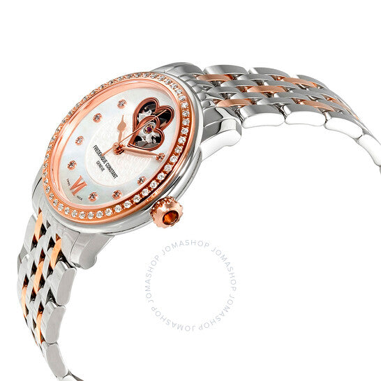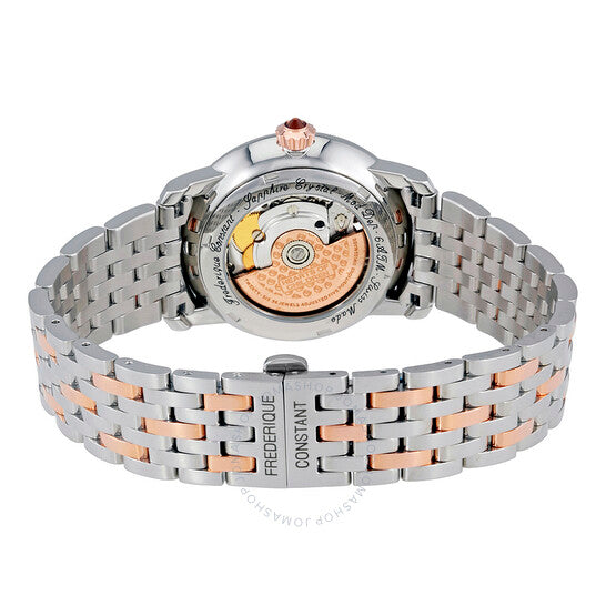 علبة من الفولاذ المقاوم للصدأ مع سوار من الفولاذ المقاوم للصدأ ثنائي اللون (فضي وذهبي وردي). إطار ثابت مطلي بالذهب الوردي مرصع بالألماس. ميناء من عرق اللؤلؤ مع عقارب ذهبية وردية وعلامات ساعات من الألماس. نوع الميناء: تناظري. حركة أوتوماتيكية من عيار فريدريك كونستانت FC-310 مع احتياطي طاقة لمدة 38 ساعة. زجاج ياقوت مقاوم للخدش. غطاء خلفي شفاف. حجم العلبة: 34 مم. سمكها: 9.9 مم. شكلها دائري. مشبك قابل للطي. مقاومة للماء حتى عمق 60 مترًا / 200 قدم. وظائفها: الساعات، الدقائق، الثواني. تصميم ساعة فاخرة. علامة الساعة: صناعة سويسرية. إصدارات المنتج: FC 310WHF2PD2B3، FC.310WHF2PD2B3، FC310WHF2PD2B3. ساعة فريدريك كونستانت وورلد هارت فيديريشن النسائية الأوتوماتيكية FC-310WHF2PD2B3.