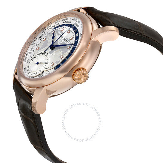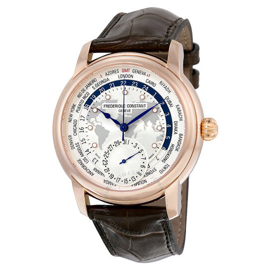 علبة من الفولاذ المقاوم للصدأ مطلية بالذهب الوردي مع سوار بني من جلد التمساح. إطار ثابت مطلي بالذهب الوردي. ميناء فضي (بنقش خريطة) بعقارب زرقاء على شكل مجرفة وعلامات ساعات منقطة. علامات ٢٤ ساعة وعلامات دقائق. مدن التوقيت العالمي حول الحافة الخارجية. نوع الميناء: تناظري. علامات مضيئة. ميناء فرعي للتاريخ عند موضع الساعة السادسة. حركة أوتوماتيكية من عيار فريدريك كونستانت FC-718، تحتوي على ٢٦ جوهرة، مكونة من ١٦١ جزءًا، تنبض بمعدل ٢٨٨٠٠ ذبذبة في الساعة، ولديها احتياطي طاقة لمدة ٤٢ ساعة تقريبًا. زجاج ياقوت مقاوم للخدش. تاج قابل للسحب/الدفع. ظهر هيكلي. شكل دائري. حجم الهيكل: ٤٢ مم. سمك الهيكل: ١٢.١ مم. عرض السوار: ٢٢ مم. مشبك تانغ. مقاومة للماء حتى عمق ٥٠ مترًا / ١٦٥ قدمًا. الوظائف: التوقيت العالمي، توقيت غرينتش، المنطقة الزمنية الثانية، التاريخ، الساعة، الدقيقة، الثانية. سلسلة وورلدتايمر. طراز ساعة السفر. علامة الساعة: صناعة سويسرية. إصدارات متنوعة: FC 718WM4H4، FC.718WM4H4، FC718WM4H4. ساعة فريدريك كونستانت وورلدتايمر أوتوماتيكية للرجال بمينا فضي، FC-718WM4H4.