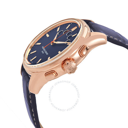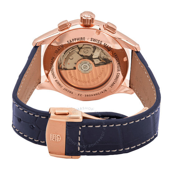 علبة من الفولاذ المقاوم للصدأ مطلية بالذهب الوردي مع سوار من جلد التمساح أزرق داكن. إطار ثابت مطلي بالذهب الوردي. ميناء أزرق داكن مع عقارب وعلامات ساعات ذهبية وردية اللون. علامات دقائق حول الحافة الخارجية. نوع الميناء: تناظري. علامات مضيئة. حركة أوتوماتيكية من عيار فريدريك كونستانت FC-380 مع احتياطي طاقة لمدة 48 ساعة. زجاج من الياقوت المقاوم للخدش. تاج قابل للسحب/الدفع. غطاء خلفي شفاف. شكل دائري. حجم العلبة: 42 مم. سمكها: 14 مم. عرض السوار: 20 مم. مشبك قابل للطي بزر ضغط. مقاومة للماء حتى عمق 100 متر / 330 قدمًا. الوظائف: الساعات، الدقائق، الثواني. طراز ساعة رسمية. علامة الساعة: صناعة سويسرية. ساعة فريدريك كونستانت يخت تايمر أوتوماتيكية للرجال FC-380NT4H4.