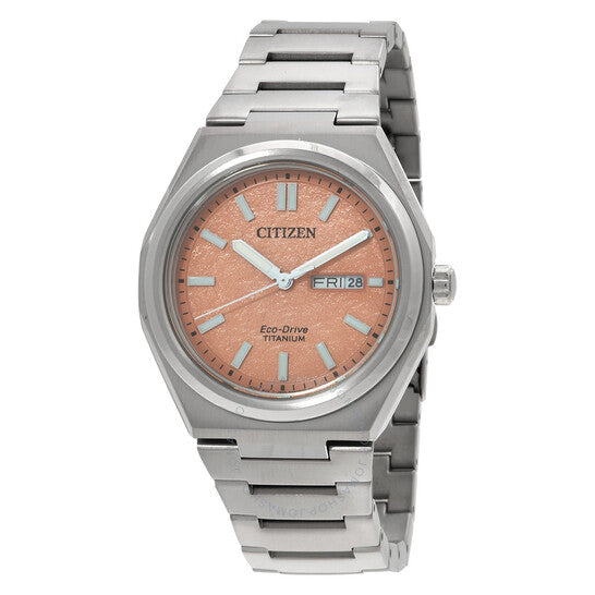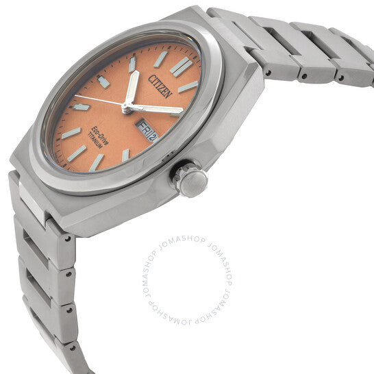 علبة وسوار من التيتانيوم الفائق فضي اللون. إطار ثابت من التيتانيوم الفائق فضي اللون. ميناء برتقالي مع عقارب وعلامات ساعات فضية اللون. علامات دقائق حول الحافة الخارجية. نوع الميناء: تناظري. عرض يوم الأسبوع والتاريخ عند موضع الساعة 3. حركة سيتيزن كاليبر إيكو-درايف J800 إيكو-درايف. كريستال ياقوتي مقاوم للخدش. غطاء خلفي صلب. شكل العلبة دائري، مقاسها: 39.5 مم، سمكها: 9.8 مم. مشبك قابل للطي مع مفتاح أمان. مقاومة للماء حتى عمق 100 متر / 330 قدمًا. الوظائف: التاريخ، اليوم، الساعة، الدقيقة، الثانية، تعمل بالطاقة الشمسية. سلسلة زينشين بثلاثة عقارب. طراز ساعة رسمية. علامة الساعة: جابان موف. ساعة سيتيزن زينشين للرجال بثلاثة عقارب بمينا برتقالي، AW0130-85Z.