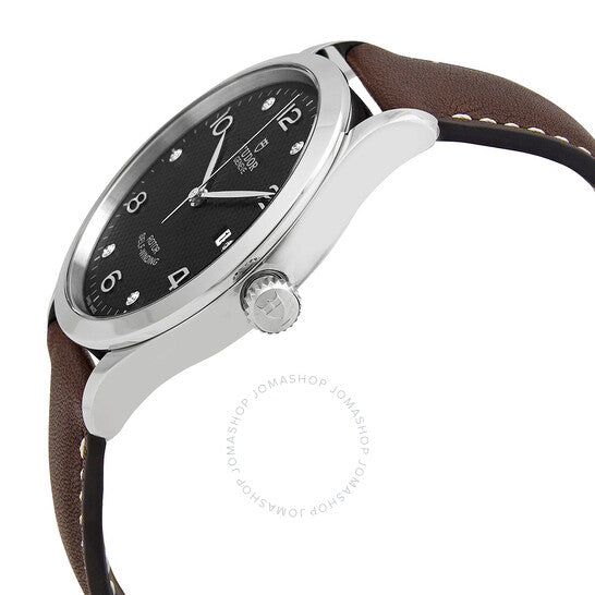 Stainless steel case with a brown leather strap. Fixed stainless steel bezel. Black dial with silver-tone hands and alternating Arabic numeral and diamond hour markers. Minute markers around the outer rim. Dial Type: Analog. Date display at the 3 o'clock position. Tudor calibre T601 automatic movement, based upon ETA 2824, containing 25 Jewels, bitting at 28800 vph, and has a power reserve of approximately 38 hours. Scratch resistant sapphire crystal. Screw down crown. Solid case back. Round case shape. Case size: 41 mm. Fold over clasp. Water resistant at 100 meters / 330 feet. Functions: date, hour, minute, second. 1926 Series. Luxury watch style. Watch label: Swiss Made. Tudor 1926 Automatic Diamond-set Black Dial Men's Watch 91650-0009.