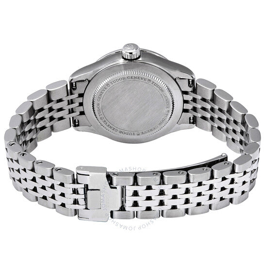 Stainless steel case with a stainless steel bracelet. Fixed stainless steel bezel. Opaline dial with blue hands and alternating Arabic numeral and index hour markers. Minute markers around the outer rim. Dial Type: Analog. Date display at the 3 o'clock position. Tudor calibre 2671 automatic movement with a 38-hour power reserve. Scratch resistant sapphire crystal. Screw down crown. Solid case back. Round case shape. Case size: 28 mm. Bracelet width: 15 mm. Fold over clasp. Water resistant at 100 meters / 330 feet. Functions: date, hour, minute, second. Casual watch style. Watch label: Swiss Made. Tudor 1926 Opaline Dial Automatic 28 mm Ladies Watch M91350-0005.