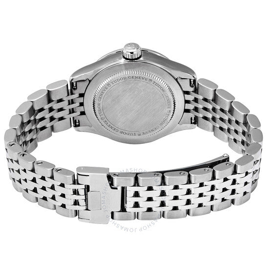 Stainless steel case with a stainless steel bracelet. Fixed stainless steel bezel. Silver dial with rose gold-tone hands and alternating Arabic numeral and index hour markers. Minute markers around the outer rim. Dial Type: Analog. Date display at the 3 o'clock position. Tudor calibre 2671 automatic movement with a 38-hour power reserve. Scratch resistant sapphire crystal. Screw down crown. Solid case back. Round case shape. Case size: 28 mm. Band width: 15 mm. Band length: 6 inches. Fold over clasp. Water resistant at 100 meters / 330 feet. Functions: date, hour, minute, second. Casual watch style. Watch label: Swiss Made. Tudor 1926 Silver Dial Automatic 28 mm Ladies Watch M91350-0001.